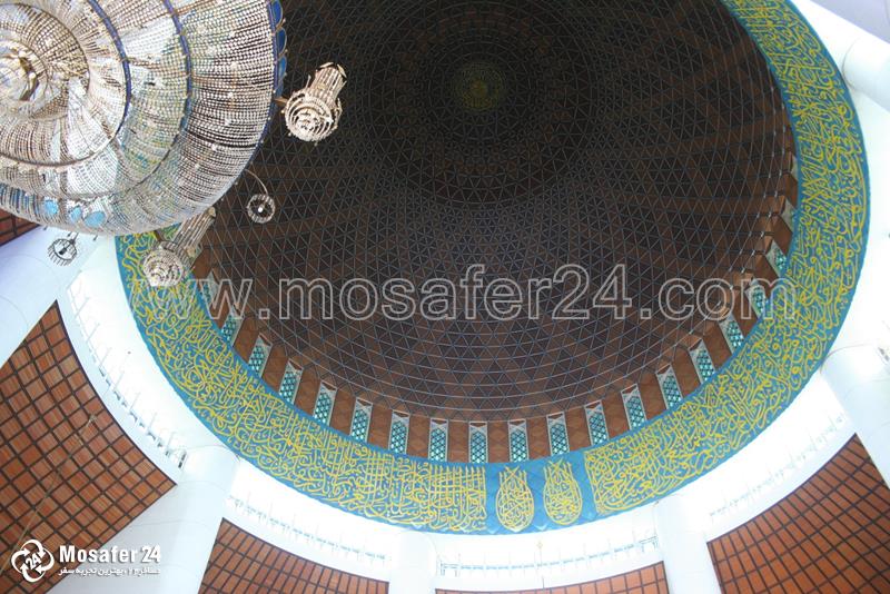 روی لبه های اطراف این گنبد و سالن نماز اصلی بیشتر از هر چیز خوشنویسی های زینتی و اسلامی به چشم می خورند، در حالیکه معماری داخلی این مسجد عناصر طراحی بومی مالایی را به تصویر می کشد. وقتی نور خورشید از شیشه آبی رنگ مسجد عبور می کند، یک فضای آبی رنگ را در داخل ساختمان بوجود می آورد که حس صلح و آرامش را در افراد تدائی می کند.