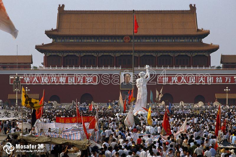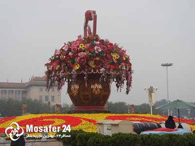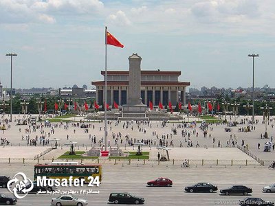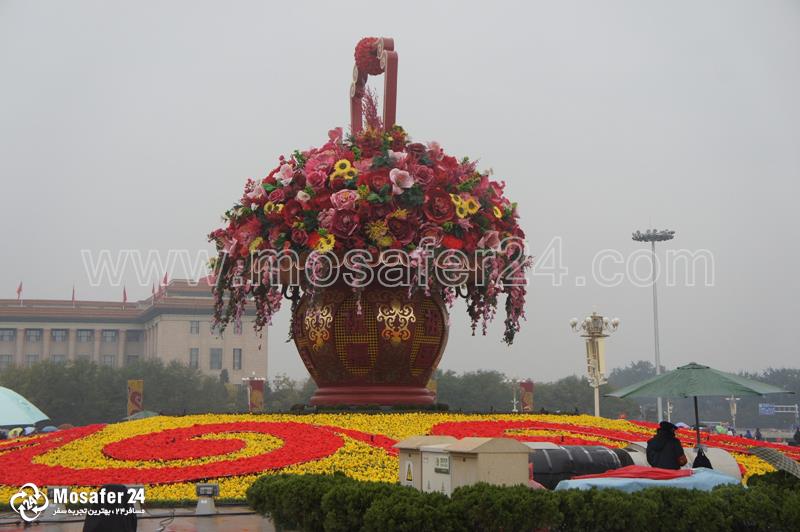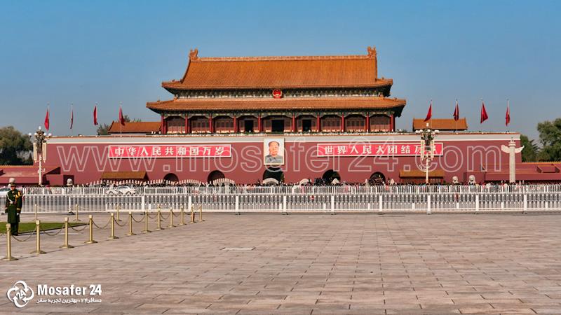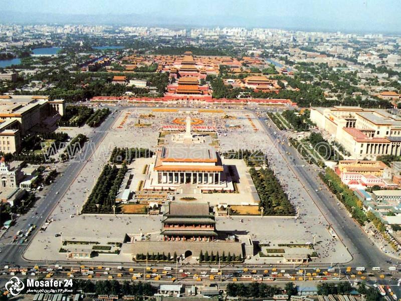 این میدان در مرکز شهر پکن قرار گرفته است و به عنوان بزرگترین میدان شهری دنیا با مساحت 440.000 متر مربع (حدود 109 هکتار) شناخته شده است که با این ابعاد میتوان برای 10.000.000 چینی خانه تهیه نمود. این میدان با هزاران گل پر زرق و برق زیبا تزئین شده است و رقص پرچم کشور چین در باد و در میان این گلها چیزی است که هیچ گردشگری آن را از دست نمی هد. این میدان بزرگ با بناهای متعددی مانند بنای قهرمانان، سالن یادبود مائوتسه تونگ، موزه ملی چین و تالار بزرگ خلق چین احاطه و تزئین شده است که روزانه هزاران گردشگر را به خود جلب می کند. در مرکز این میدان بنای یاد بود قهرمانان کشور با 37.94 متر ساخته شده از سنگ گرانیت به یاد قهرمانان ملی چین چشم هر بیننده ای را به خود خیره میکند. برج معروف تیان آن من یا بنای ممنوعه در جنوب این میدان در سال 1417 در دوران سلسله مینگ (1644-1368) ساخته شده است که در آن زمان بر اساس بیانیه ای مردم عادی از ورود و بازدید به این کاخ ممنوع شدند. همچنین در جنوب میدان سالن یاد بود مائوتسه تونگ اولین رئیس جمهور چین قرار دارد که بشدت توسط مردم چین مورد احترام و تحسین است. این بنا در سال 1977 ساخته شده و دارای 3 قسمت متفاوت شامل سالن اصلی، سالن شمال و جنوب می شود که جسد مائوتسه تونگ در تابوتی بلورین در سالن اصلی به نمایش عموم گذاشته شده است. در شرق این میدان موزه ملی چین که گنجینه بسیار بزرگی از تاریخ فرهنگ و تمدن کشور چین است قرار دارد. این موزه شامل بیش از 3 میلیون اثر تاریخی و 4500 مقاله و سند تاریخی است که تاریخ فرهنگ و تمدن درخشان چین را به نمایش می گذارد. در غرب این میدان تالار بزرگ خلق چین قرار دارد که در سال 1959 ساخته شده است و مساحتی در حدود 170 هزار متر مربع را شامل می شود. این بنا به دلیل برگزاری کنگره خلق چین به تالار بزرگ خلق نامیده میشود. این بنا یکی از ساختمانهای با شکوه میباشد که در بدو ورود ستونهای بلند مرمر سفید با لوسترهای کریستال بزرگ چشم هر بیننده ای را به خود خیره می کند.